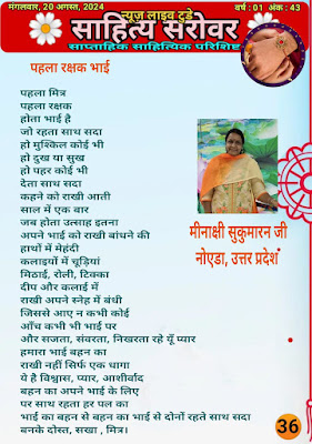 ’साहित्य सरोवर’ साप्ताहिक साहित्यिक e परिशिष्ट, वर्ष : 01 अंक : 43 On August 19, 2024 साहित्य सरोवर, 🌺🌼 रक्षा बंधन विशेषांक 🌼🌺 Share To: NextNewer Post PreviousOlder Post