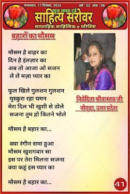 ’साहित्य सरोवर’ साप्ताहिक साहित्यिक e परिशिष्ट, वर्ष : 02 अंक : 08 On December 17, 2024 साहित्य सरोवर, 🌷 बहारों का मौसम 🌷 Share To: NextNewer Post PreviousOlder Post
